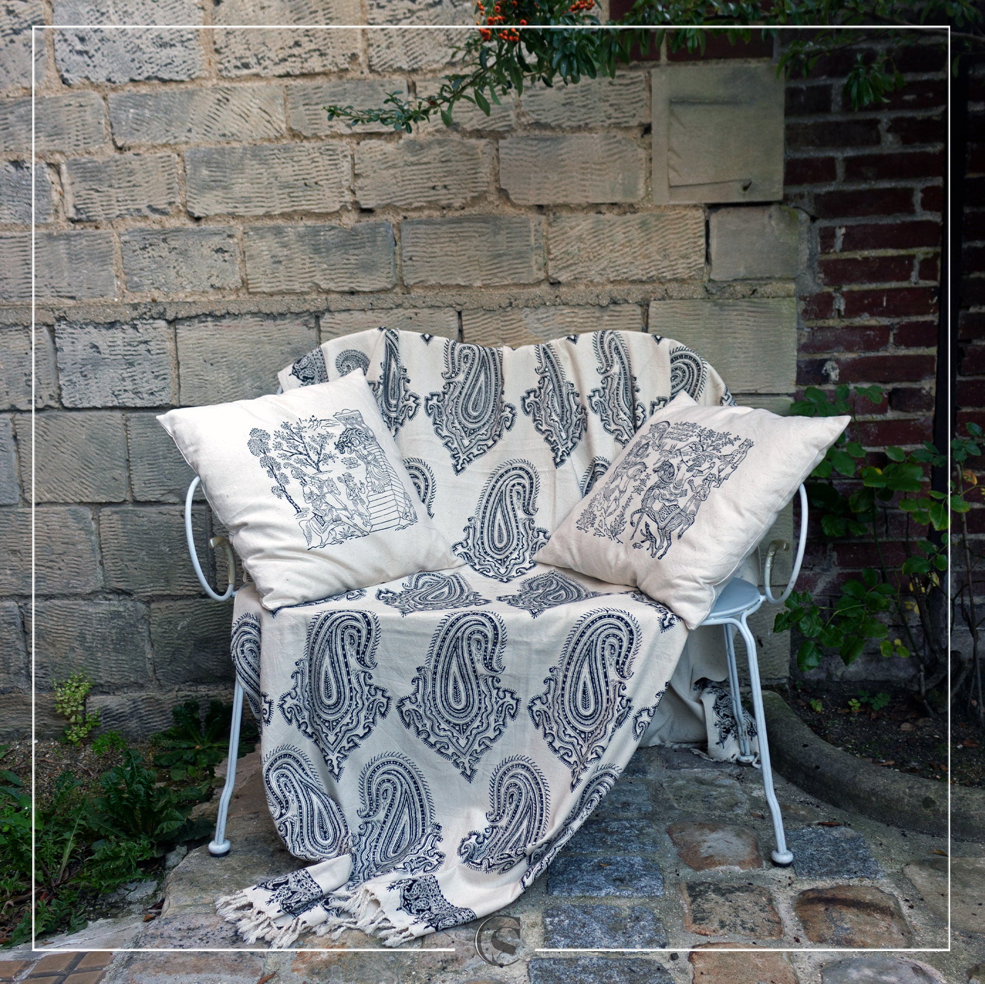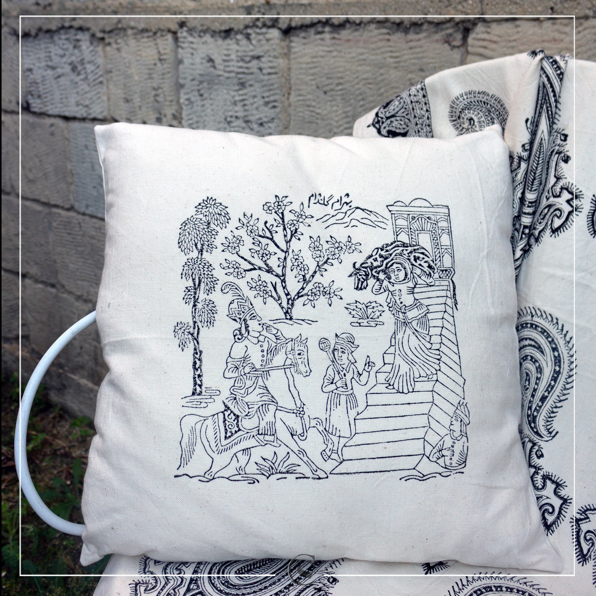 Pour un intérieur cosy et tendance, osez les motifs. Comme une invitation au voyage, les coussins Barham et Golandam présentent deux épisodes de l’histoire du roi perse Bahram roi sassanide et de sa courtisane chinoise bien-aimée Golandam, deux personnages figurant dans le Haft Peykar de Nizami et Shah name. Ils sont travaillés avec les techniques du Qalamkar et imprimés au bloc avec des couleurs naturelles.
