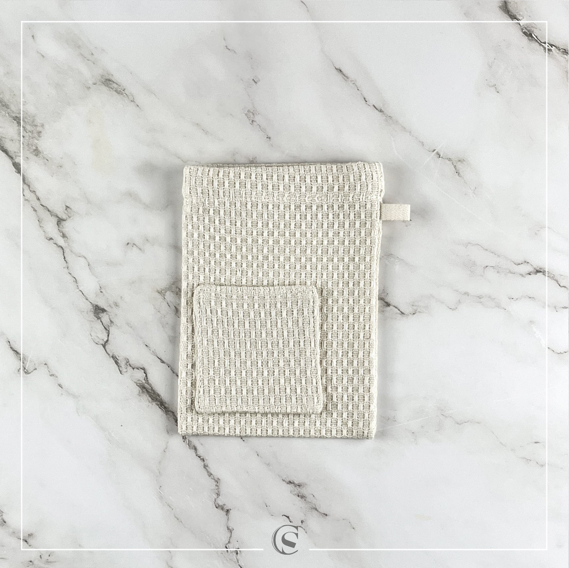 Ce coffret associe un gant exfoliant doux et trois cotons démaquillants lavables. Conçu artisanalement, il prend soin de la peau au quotidien avec respect et élégance.